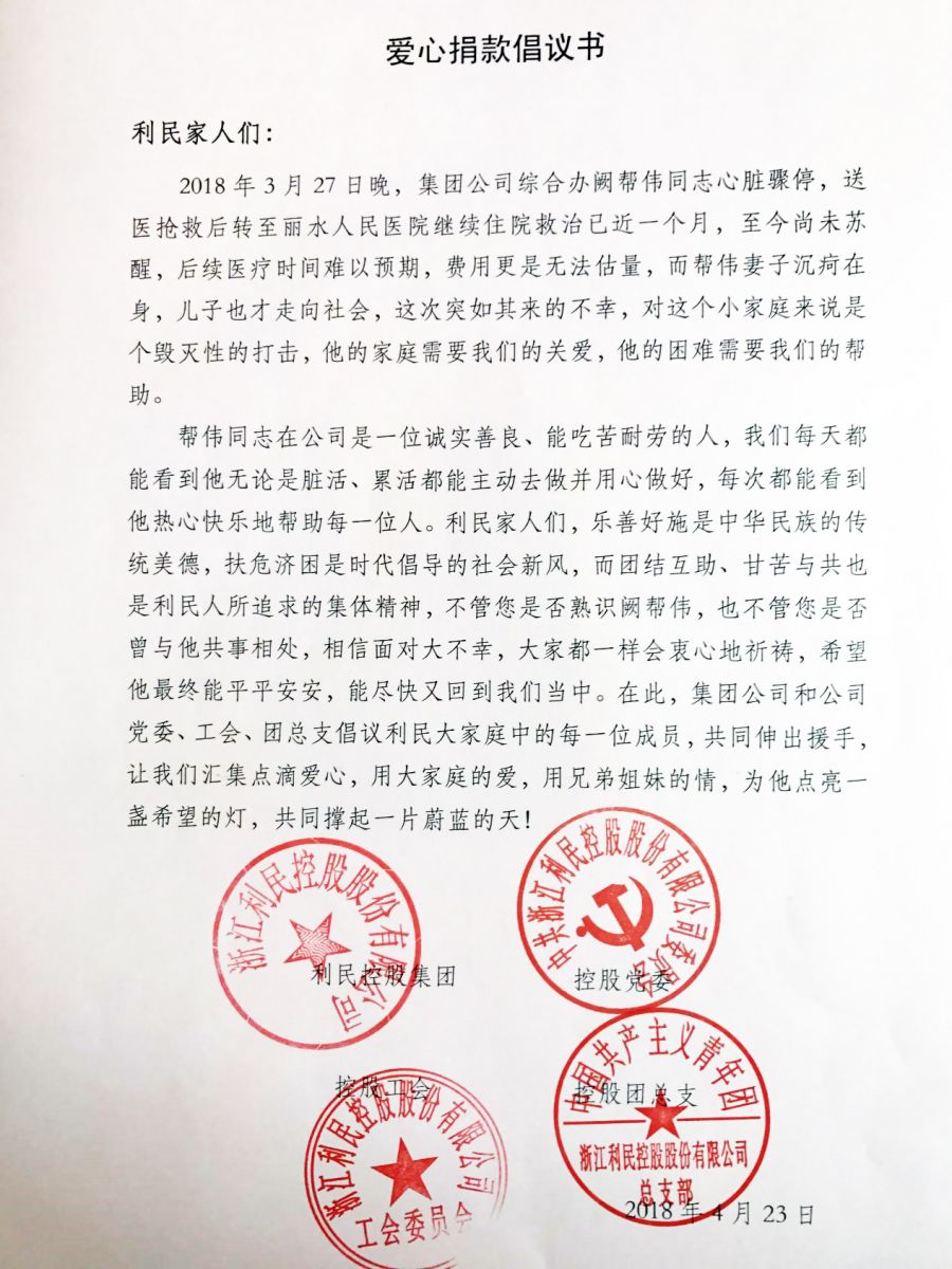 而當(dāng)公司一名員工突發(fā)意外而致使其家庭陷入困境的時(shí)候,正是利民大家庭中的每一位成員,在公司黨政工團(tuán)的共同倡議下,在雙節(jié)期間用大家庭的愛(ài),用兄弟姐妹的情,共同匯集愛(ài)心,都伸出援手希望能為他點(diǎn)亮一盞希望的燈,幫他撐起一片晴朗的天!這是利民人團(tuán)結(jié)奉獻(xiàn)、關(guān)愛(ài)他人、患難扶持的“利民家人”企業(yè)文化建設(shè)的一次成果,也是利民控股在圍繞社風(fēng)慈善、扶貧濟(jì)困方面履行的一個(gè)優(yōu)秀企業(yè)的社會(huì)責(zé)任的一次展現(xiàn)。今后,利民控股還將從公司實(shí)際出發(fā),與社會(huì)主義核心價(jià)值觀踐行、青年員工思想道德引領(lǐng)等工作有機(jī)結(jié)合,進(jìn)一步提升“慈孝文化”的參與度、精準(zhǔn)度,為“慈孝遂昌”建設(shè)貢獻(xiàn)一股“利民力量”!