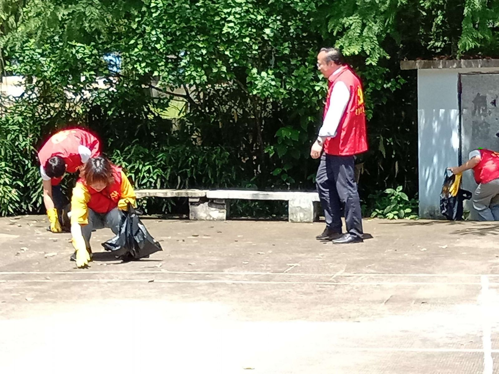 活動(dòng)最后,黨員們?cè)诹沂磕箯V場(chǎng)及周邊拾撿垃圾、撥除雜草。