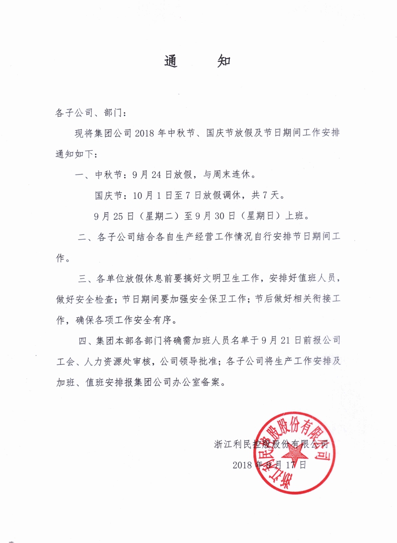 關(guān)于2018年中秋、國(guó)慶期間工作安排的通知